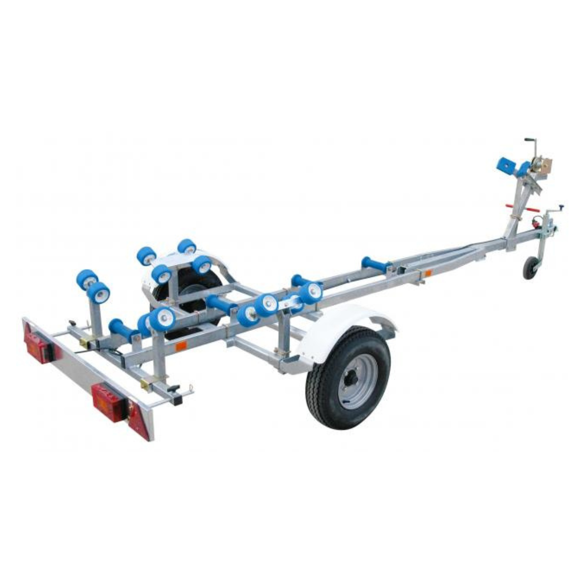 La remorque porte-bateau T6M est conçue pour faciliter le transport et la mise à l’eau des embarcations de loisirs. Son chemin de roulement central, complété par des galets latéraux, garantit un guidage précis de la coque et un maintien fiable durant les déplacements.