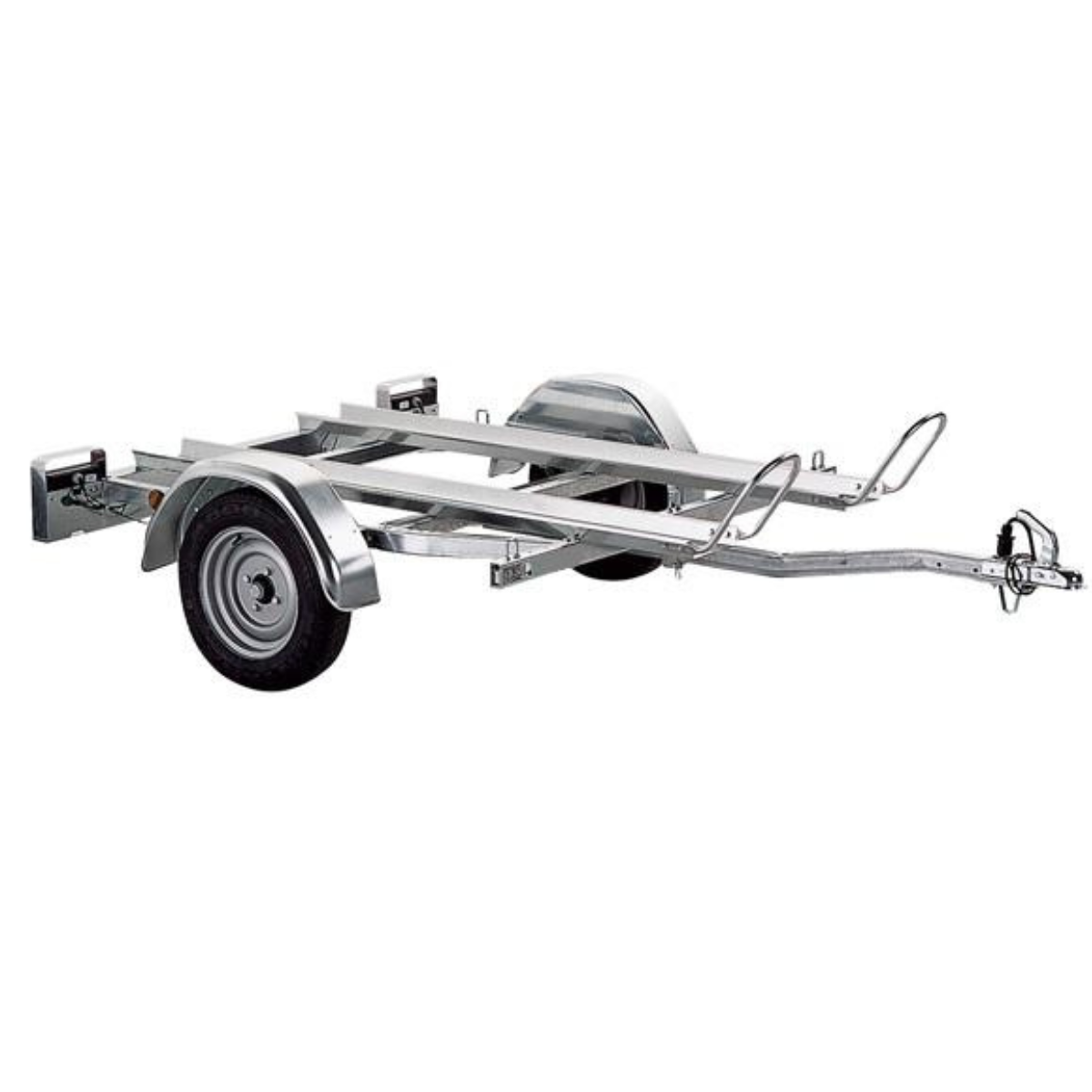 Avec un essieu de 600 kg et des roues de taille automobile (135R13), la remorque reste stable et facile à tracter, même sur de longues distances. La charge utile de 395 kg et le PTC de 500 kg sont adaptés pour accueillir deux motos standard sans compromettre la sécurité.